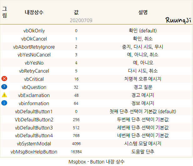 MsgBox "내용", vbYesNo + vbCritical, "제목"'
