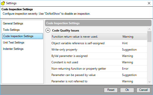 모범사례는 항상 변수를 선언하는 것이고, 변수 미선언으로 인한 나머지 Rubberduck 검사의 기본 심각도 수준은 Error
