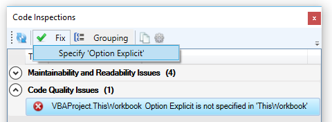 보통 검사기는 하나 이상의 "빠른-수정 (quick-fixes)"를 제공하는데, 가끔 모듈이나 프로젝트에 한번에 적용될 수도 있습니다. 위 사진의 하단 링크 "Fix all occurrences in project"로, 프로젝트의 모든 모듈에 Option Explicit