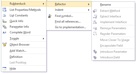 Rubberduck 1.3은 이름 바꾸기(Rename)과 메소드 추출 리팩터링(Extract Method refactorings)이 적용되었습니다; v1.4.3에서는 파라미터 제거(Remove Parameters)와 리오더 파라미터 리팩터링(Reorder Parameters refactorings)이 적용되었습니다.